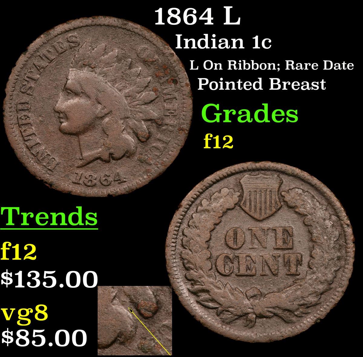 1864 L Indian Cent 1c Grades f, fine. Very scarce 1864 L on ribbon Indian cent variety. According to David Hall, “The 1864-L is scarce in circulated grades and very scarce in mint state. However, its price has as much to do with its popularity and importance to collectors as it does with its scarcity. All 1864-L Indian cents have a pointed bust on Ms. Liberty, while the no L’s have a rounded bust. So sometimes low grades are designated (correctly) as L’s even if you can't really see the L.