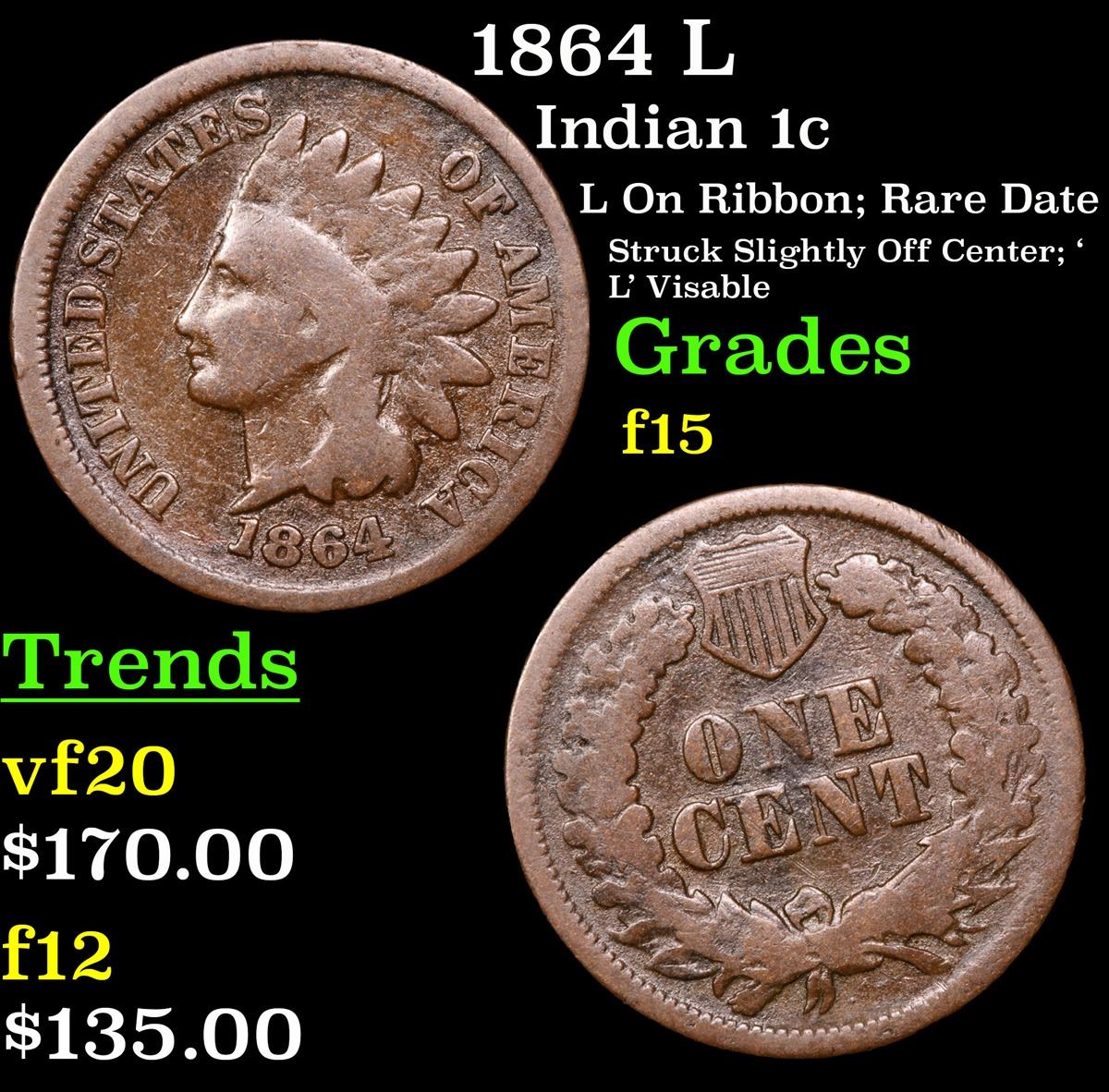 1864 L L On Ribbon; Rare Date Struck Slightly Off Center; 'L' Visable Indian Cent 1c Grades f+. Very scarce 1864 L on ribbon Indian cent variety. According to David Hall, “The 1864-L is scarce in circulated grades and very scarce in mint state. However, its price has as much to do with its popularity and importance to collectors as it does with its scarcity. All 1864-L Indian cents have a pointed bust on Ms. Liberty, while the no L’s have a rounded bust. So sometimes low grades are designated (correctly) as L’s even if you can't really see the L.