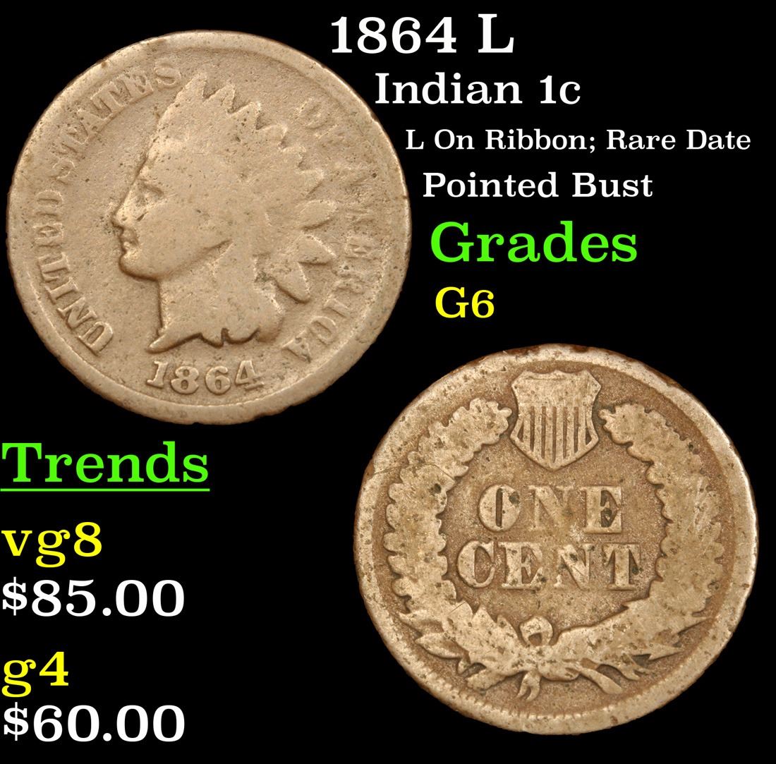 1864 L L On Ribbon; Rare Date Pointed Bust Indian Cent 1c Grades g+. Very scarce 1864 L on ribbon Indian cent variety. According to David Hall, “The 1864-L is scarce in circulated grades and very scarce in mint state. However, its price has as much to do with its popularity and importance to collectors as it does with its scarcity. All 1864-L Indian cents have a pointed bust on Ms. Liberty, while the no L’s have a rounded bust. So sometimes low grades are designated (correctly) as L’s even if you can't really see the L.