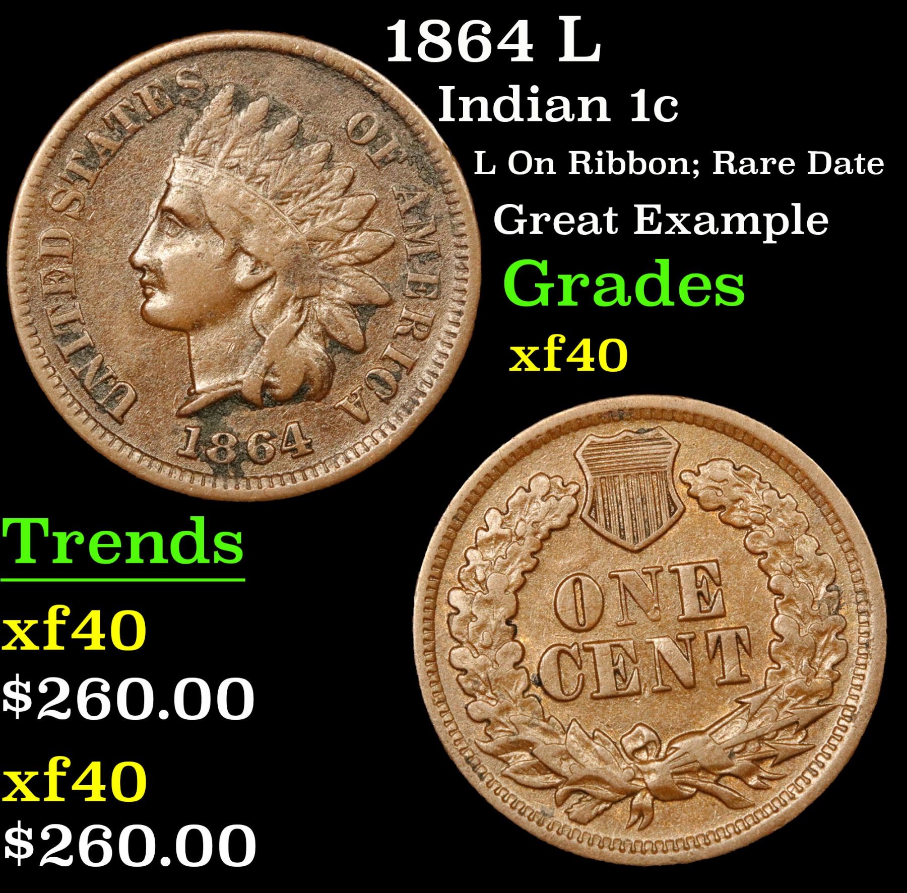 1864 L L On Ribbon; Rare Date Great Example Indian Cent 1c Grades xf. Very scarce 1864 L on ribbon Indian cent variety. According to David Hall, ÒThe 1864-L is scarce in circulated grades and very scarce in mint state. However, its price has as much to do with its popularity and importance to collectors as it does with its scarcity. All 1864-L Indian cents have a pointed bust on Ms. Liberty, while the no LÕs have a rounded bust. So sometimes low grades are designated (correctly) as LÕs even if you can't really see the L. A Corey's Pick, Bid to Win, Don't let it get Away Coin