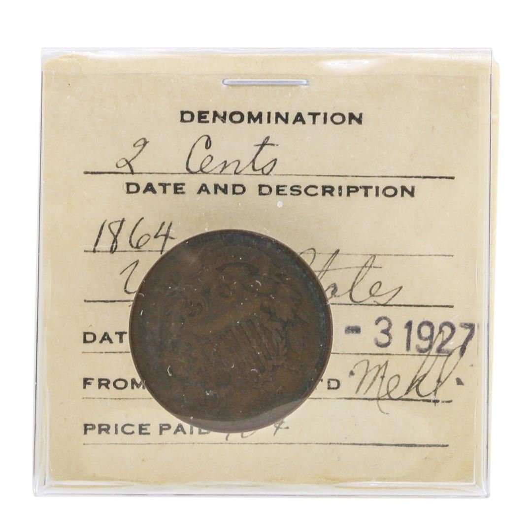 One 1864 Large Two Cent Coin in Old Flip in Old Flip.