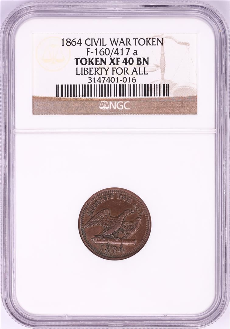 One 1864 Liberty For All Civil War Token NGC XF40 BN F-160/417a. NGC Certified.