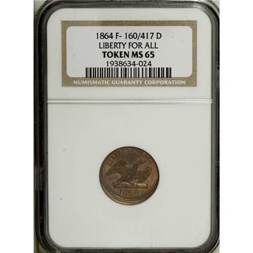 <B>1864 Liberty For All, Fuld 160/417D, MS65 NGC.</B></I> Copper. A choice red-brown example (not described on the NGC insert) with 75% of the original mint luster remaining. Kanzinger designates this token as an R.8. This piece was struck 5% off-center. The current catalog value in MS60 is $300. With the strike error and Gem grade, this piece is sure to draw attention from Civil War token collectors.<BR><BR><b>Shipping:</b> Coin/Currency (<a target="_blank" href="http://www.heritageauctions.com/common/shipping.php">view shipping information</a>)