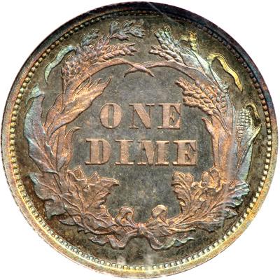 1864 Liberty Seated Dime. NGC graded Proof 67. Attractive delicate sunset toning on both sides. Only 470 Proofs made. This is one of the rare dates from the 1860s when production declined to lower levels than before. A spectacular Proof! Survival was hit or miss at the upper end of the grade scale, as this low census confirms: Pop 5; 1 better in 67*.