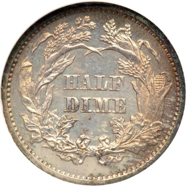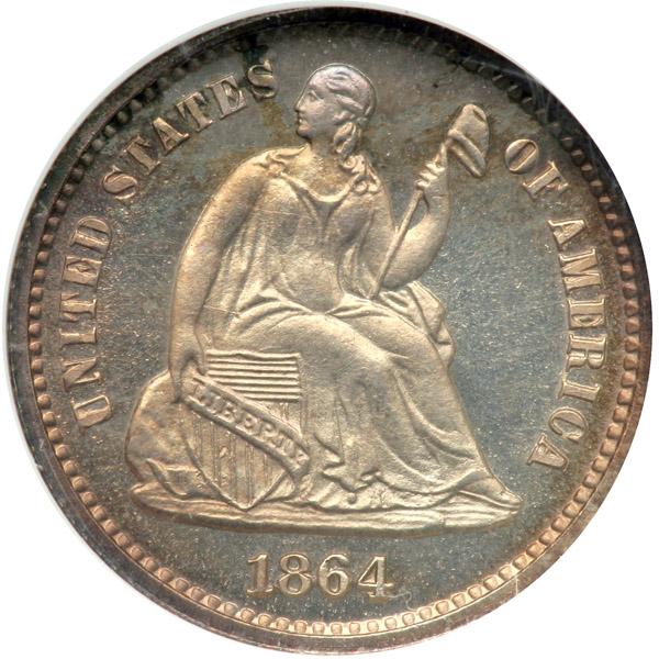 1864 Liberty Seated Half Dime. NGC graded Proof 63. Attractive (and even) gold toning graces this choice example, one of the lowest Proof mintage dates in the series with only 470 Proofs struck. Pop 37.