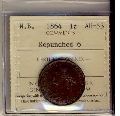 1864 N.B. 1¢ Repunched 6 ICCS AU55. Brown and well struck.