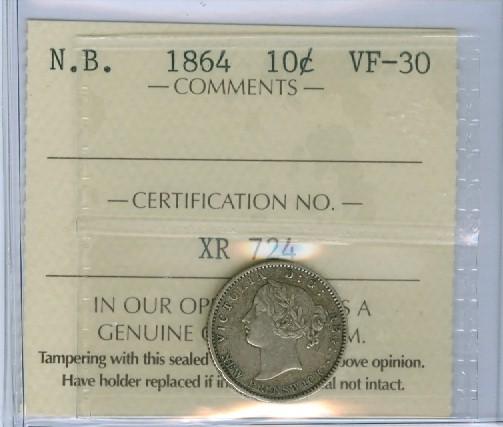 1864 N.B. 10¢ N.B. ICCS VF30. Lightly toned.