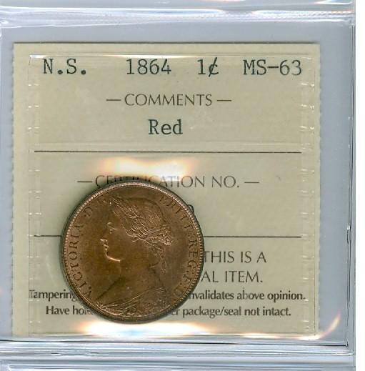 1864 N.S. 1¢ ICCS MS63RD. A super example quite appealing to the eye.