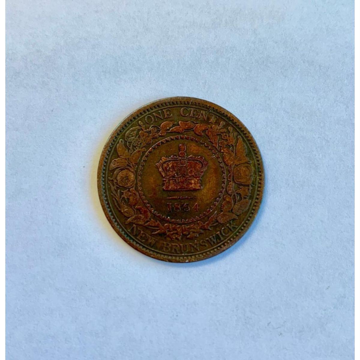 Obverse Wreathed bust facing left Lettering: VICTORIA D:G: BRITT:REG:F:D: Engraver: Leonard Charles Wyon Reverse Crown above dividing line above date. Beaded circle around, ornate border of leaves and flowers intertwined. Value lettering at top, country at bottom Lettering: ONE CENT 1861 NEW BRUNSWICK Engraver: Horace Morehen Edge Plain Specifications Country: Canadian provinces (New Brunswick) (Canada) Type: Standard circulation coin Years: 1861-1864 Value: 1 Cent (0.01) Currency: Dollar (1860-1867) Composition: Bronze Weight: 5.633 g Diameter: 25 mm Thickness: 1.8 mm Shape: Round
