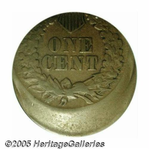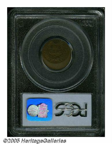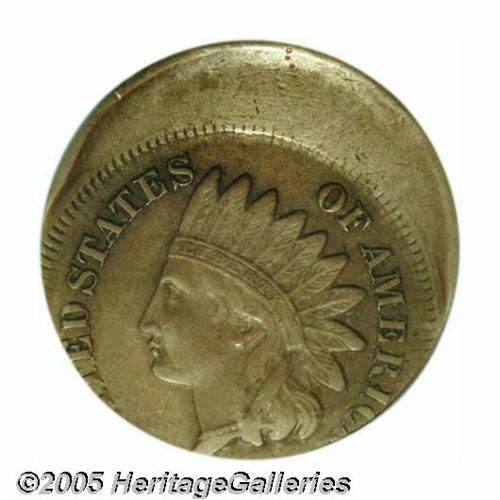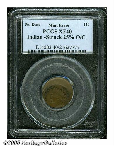 <B>1864 No L<1C> Indian Cent--Struck 25% Off Center--XF40 PCGS.</B></I> The bronze alloy and the absence of an L initial on the ribbon confirm that this piece is an 1864 No L variety, although the date has been completely eliminated by major movement toward 7 o'clock.<BR><I>From The Larry Rausch Collection, Part Five.</B></I>