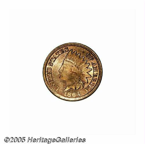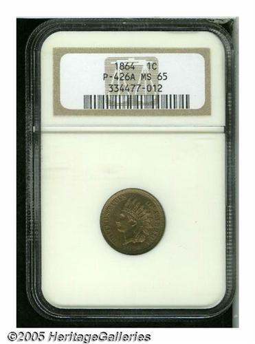 <B>1864 One Cent, Judd-356b (unlisted in earlier editions), Pollock-426a, Snow PT1-3c, R.8, MS65 NGC.</B></I> The dies are those of the regular issue 1864 No L Indian Cent, but, while struck in copper-nickel, this coin was impressed on a planchet whose thickness most closely resembles that of the bronze Cents. Pollock (1994) was aware of only one example of this variety, the coin that sold as lot 656 in Stack's October 1992 sale of the Floyd T. Starr Collection. We do know of a second example, the coin that was offered as lot 7460 in our February 2001 Long Beach Signature Sale, and the present representative appears to be a third. Whereas the other two coins are proofs, NGC has designated this coin a business strike. Both sides are overall medium tan in appearance with blushes of delicate champagne tinting here and there. The date and the upper portion of the shield are indistinct, while the portrait and remaining legends are bold. For pedigree purposes, two miniscule green flecks are noted on the obverse denticles at 11 o'clock and between a pair of feather tips.
