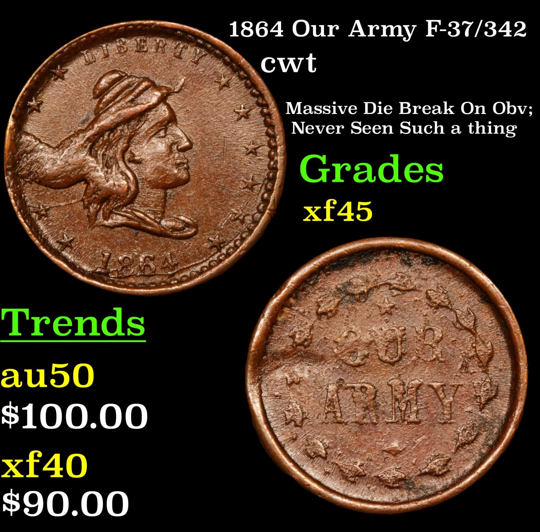 1864 Our Army F-37/342 Civil War Token 1c Grades xf+.