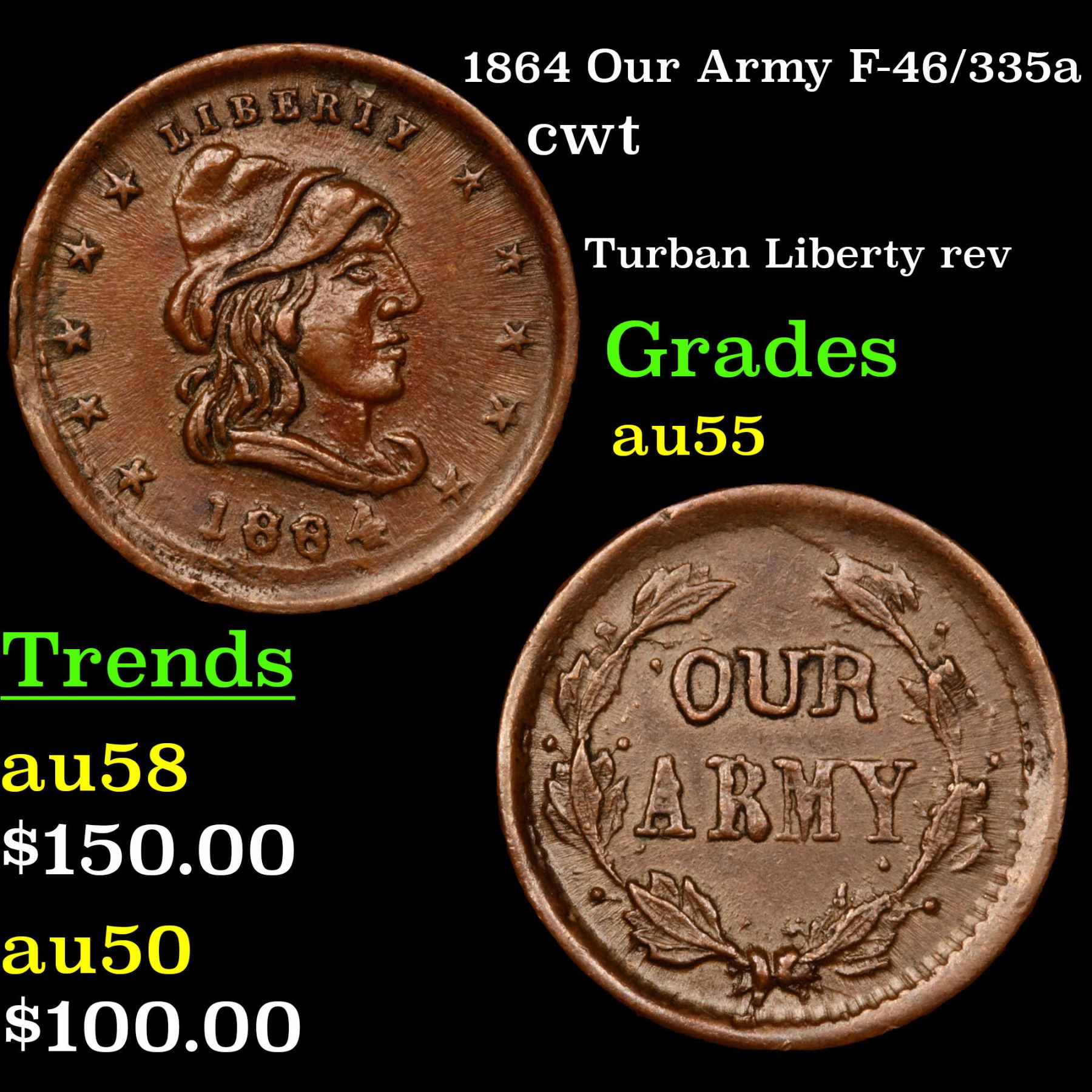 1864 Our Army F-46/335a Civil War Token 1c Grades Choice AU.