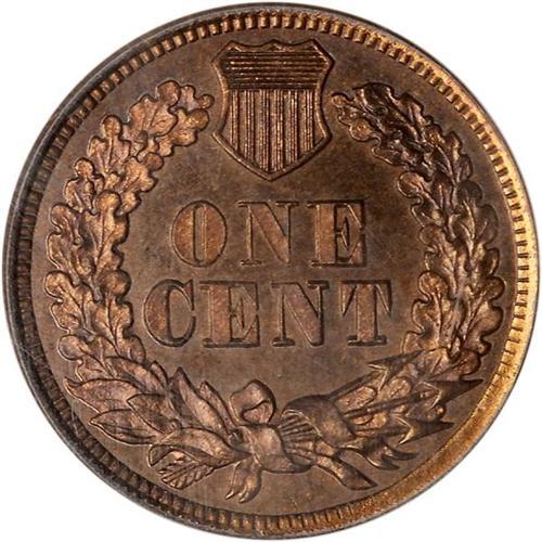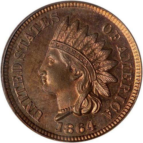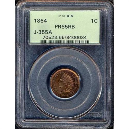 <b>1864 Pattern Cent. Copper-aluminum, plain edge. Judd-355A. Pollock-425. PCGS graded PF65 RB.</b> Since the time this coin was housed in one of the early green-tag PCGS holders, Judd-355A has been "delisted" from the roster and lumped together with the less rare copper-aluminum Judd-355 specimens (P-425). All the same it is a desirable item and is in an even more enviable position because this specimen grades Gem Proof 65. Very well defined, right down to the end of the first feather tips, the coin boasts frosty deep-red devices that are colorfully framed by mirror-smooth iridescence in the fields.