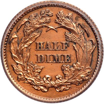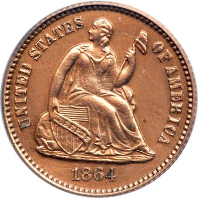 1864 Pattern Half Dime. Copper, plain edge. Judd-378. Pollock-446. Low Rarity 7. PCGS "Genuine" Proof. Our Grade is Proof 60+. Probably cleaned long ago, still quite pleasing as one of the rare off-metal Patterns of this design. Copper pieces were struck from the regular Proof dies either to test the dies, or possibly as favors to coin collectors, a steady practice at the U.S. Mint since time immemorial (PCGS # 60549).