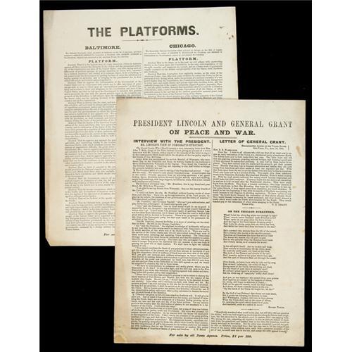 <Our item number 109823><B>1864 Platforms For the Republican and Democratic Parties.</B> Broadsheet, 11½" x 9¾", printed on the left side with the platform of the Republican Party, which nominated Abraham Lincoln for re-election as President, and Andrew Johnson as Vice-President; on the right side is the platform of the Democratic Party, which nominated George B. McClellan for President and George H. Pendleton for Vice-President. A second broadside reports an interview with President Lincoln prior to the 1864 election and a letter from General Grant. Both very good; some toning and soiling. <BR>Estimated Value $200-300. <BR><BR>Our item number 109823<BR><IMAGES><P ALIGN="CENTER"><IMG SRC="http://64.60.141.195/photos/40jpegs/109823.jpg"> </P></IMAGES>