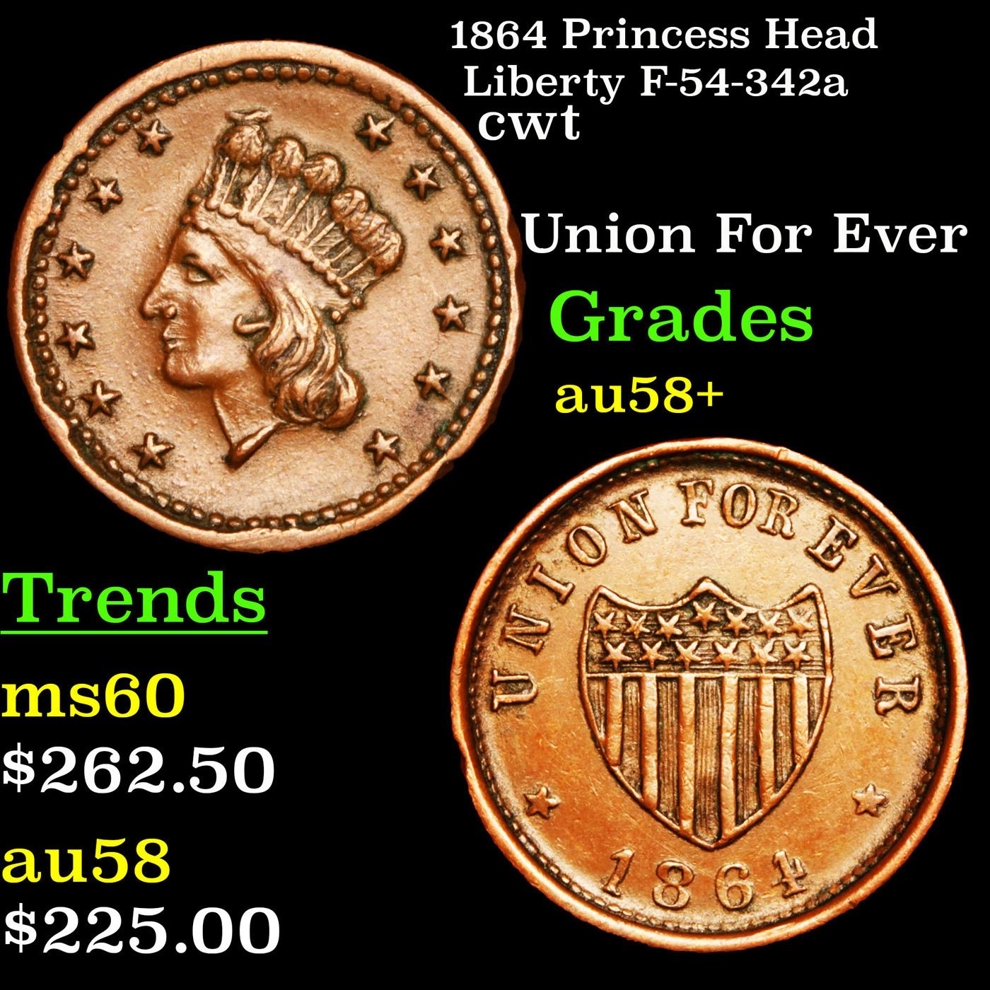 1864 Princess Head Liberty F-54-342a Civil War Token 1c Grades Choice AU/BU Slider+. Obverse- Priness Head Liberty Reverse- Union For Ever