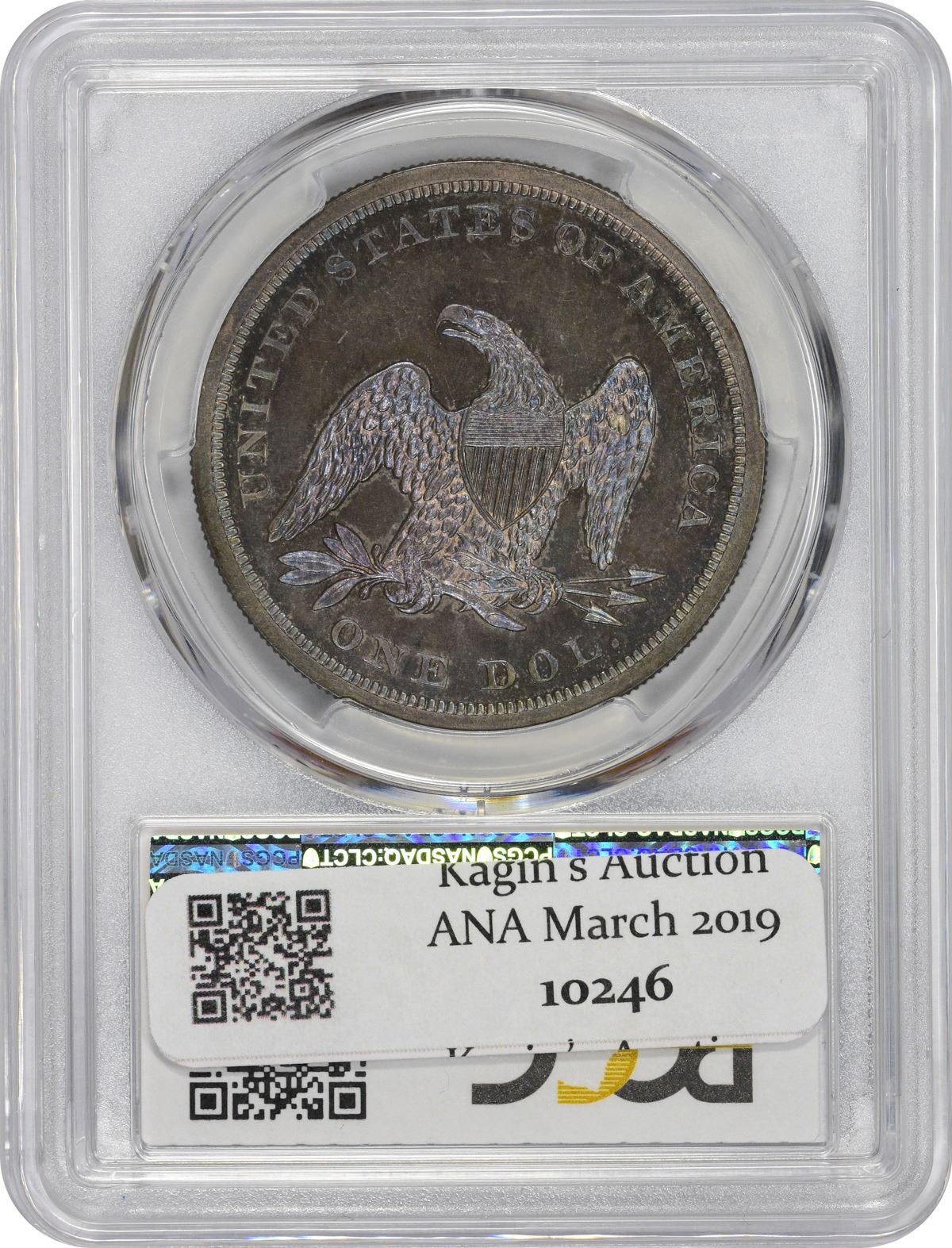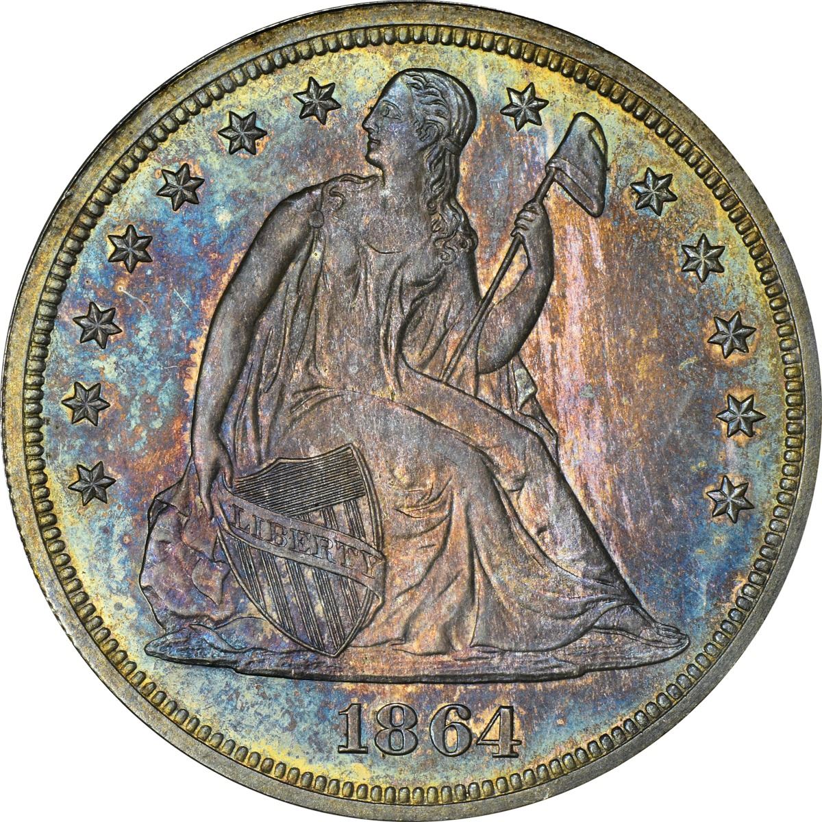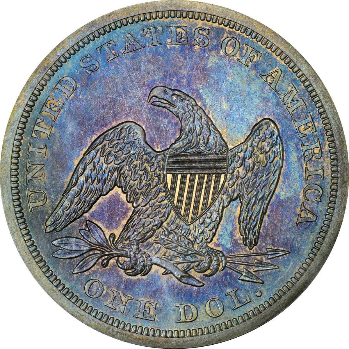 This memorable gem Proof silver dollar features fiery violet and lively neon blue iridescence in a pleasing array throughout both sides; the devices are frosty and the fields are colorful mirrors. From a modest Civil War-era mintage of just 470 pieces, and among the fewer than two dozen Proof-65 or finer examples of the date seen by PCGS. Choice for the grade with a needle-sharp strike, exceptional eye appeal, and blemish-free surfaces. Don’t let this one get away! PCGS Population: 19: 4 finer (Proof-67 finest). PCGS #7007