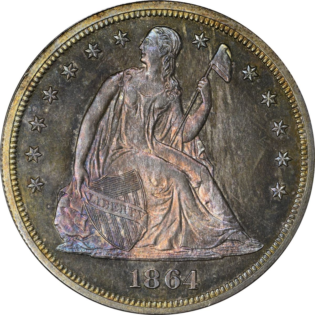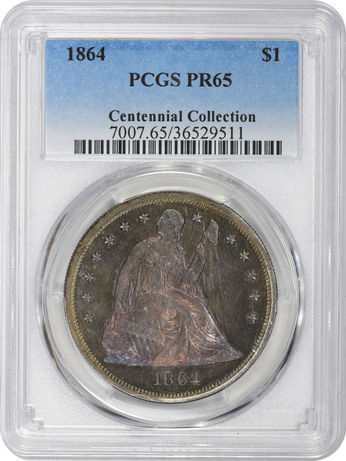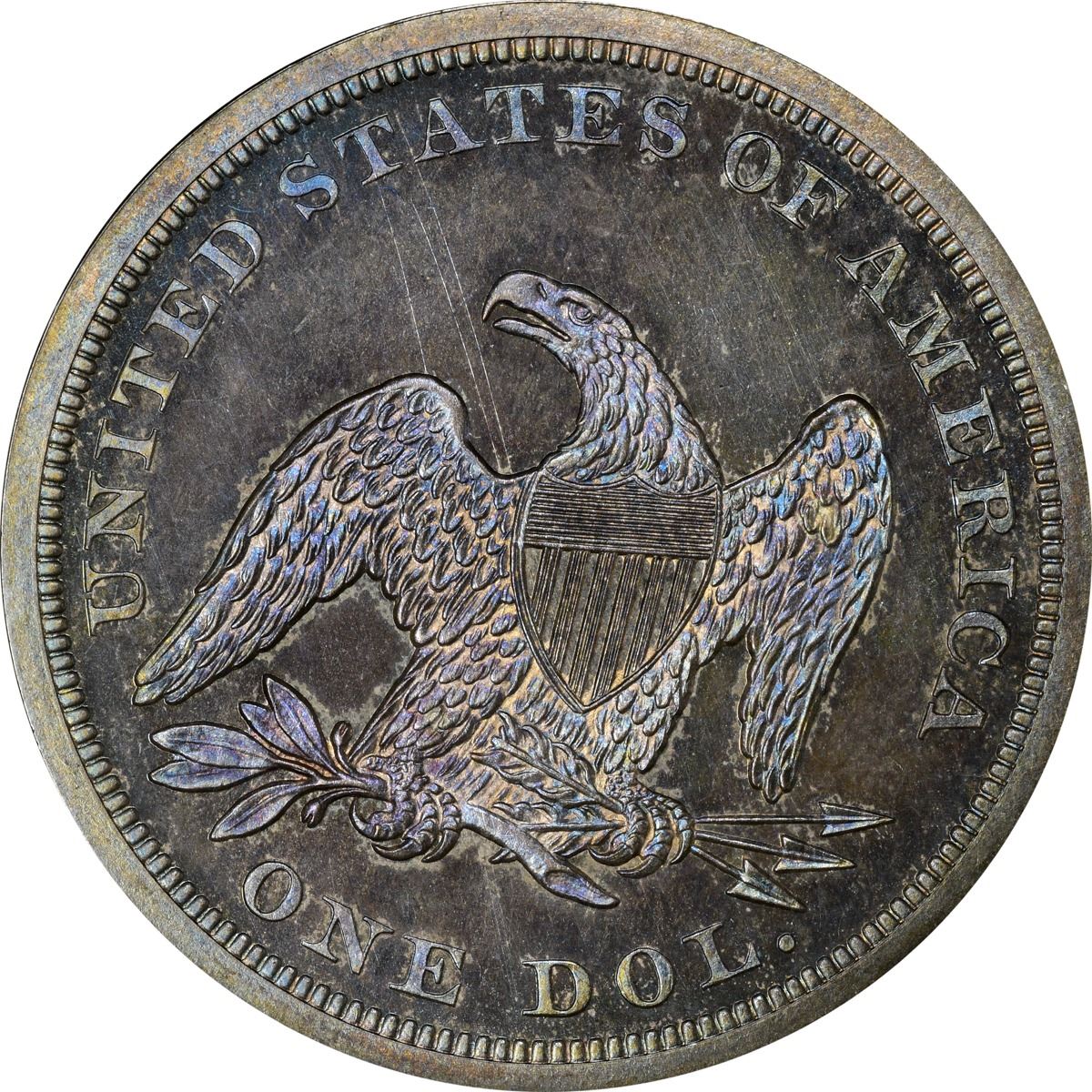 This memorable gem Proof silver dollar features fiery violet and lively neon blue iridescence in a pleasing array throughout both sides; the devices are frosty and the fields are colorful mirrors. From a modest Civil War-era mintage of just 470 pieces, and among the fewer than two dozen Proof-65 or finer examples of the date seen by PCGS. Choice for the grade with a needle-sharp strike, exceptional eye appeal, and blemish-free surfaces. Don’t let this one get away! PCGS Population: 19: 4 finer (Proof-67 finest). PCGS #7007