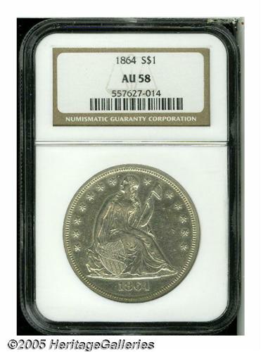 <B>1864<S$1> AU58 NGC.</B></I> A silvery-grey example with nice luster, and numerous light wispy marks, including one in the right obverse extending in to Liberty's leg.