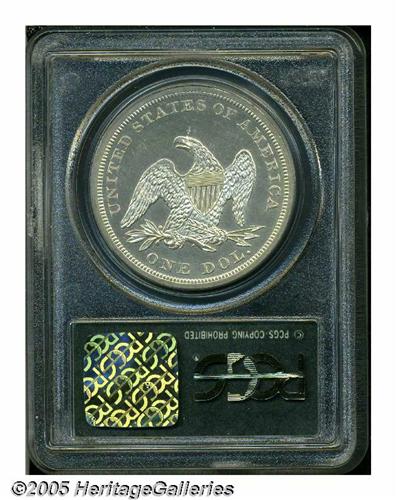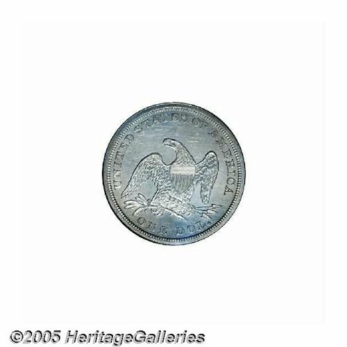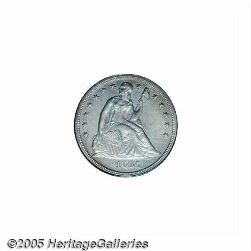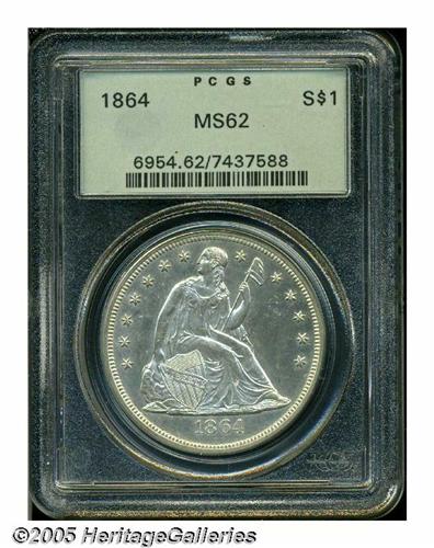 <B>1864<S$1> MS62 PCGS.</B></I> Bowers (1993) notes that silver dollars of the 1864 year did not circulate domestically, and their rarity today, especially in Mint State, is explained by the fact that most were exported. PCGS has seen 21 Uncirculated specimens, and NGC just 14 (6/05). It is likewise instructive to review past auction records, indicating that only 17 Mint State examples have made appearances through the major houses over the past 15 years. The MS62 specimen offered in this lot displays crisply struck design elements, and bright surfaces visited by whispers of faint tan-gray color in localized areas. A few trivial marks are reported on Liberty's motif, but these, along with wispy slidemarks in the fields, are not offensive. Population: 5 in 62, 15 finer (6/05).<BR><I>From The Dr. John L. Pellegrini Collection of Liberty Seated Dollars.</B></I>