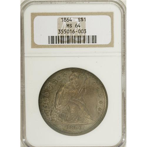 <B>1864 S$1 MS64 NGC.</B></I> A deeply toned near-Gem example, this piece has reflective fields and excellent design definition with the unquestioned surfaces of a rare business strike example. While many proofs exist for this date, few business strikes have survived in the higher numerical grades as evidenced by the current population of this date. The same is true for all Civil War era issues of the largest silver denomination. Both sides of this piece have a few grade-limiting abrasions beneath the mottled golden-brown and iridescent toning. Census: 6 in 64, 7 finer (4/07).<BR><BR><b>Shipping:</b> Coins & Currency (<a target="_blank" href="http://www.heritageauctions.com/common/shipping.php">view shipping information</a>)