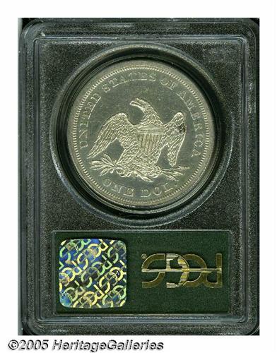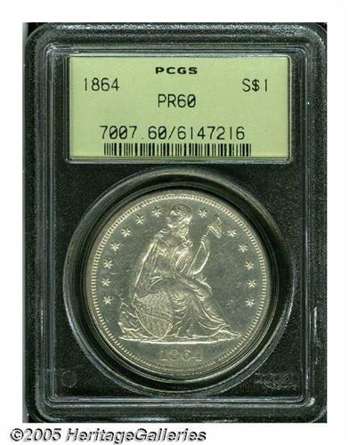 <B>1864<S$1> PR60 PCGS.</B></I> Deeply reflective fields and showing modest contrast between the fields and the lustrous devices. Though obviously hairlined, the intense depth of the mirrors in the fields tends to overpower these post-striking deficiencies, making this a premium coin for the grade. A small russet-brown splotch, near the outer edge of the eagle's right (facing) wing, is noted as a possible future pedigree marker.<BR><I>From The Dr. John L. Pellegrini Collection of Liberty Seated Dollars.</B></I>