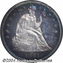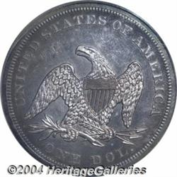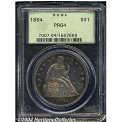 <B>1864<S$1> PR64 PCGS.</B></I> Because of the extreme scarcity of business strikes of this date, there is considerable date pressure on the 470 proofs that were produced of the 1864. This is a lovely example that has deeply reflective mirrors in the fields and interesting toning. The obverse has an intermingling of reddish-golden and cobalt-blue toning, while the reverse is more of a gray-rose color with crimson accents in the protected areas. Judging from the grade of this coin, there must be several contact marks present, but the moderate toning overlay does a good job of concealing them. <BR><BR><B>Important notice:</B> Heritage usually auctions material at the rate of 200-250 lots per hour. On some occasions eBay Live bid software or the Internet may not be able to keep up with the pace of the auction. We recommend placing a realistic absentee bid now as insurance to avoid disappointment. Occasionally the auctioneer may eliminate or reject an eBay Live bid, and the auctioneer may also reopen a lot after the close of the eBay live bidding (usually because we missed an audience bid), and may reject your bid even if it shows you as the winning bidder. By bidding via eBay Live, you agree that Heritage may award the lot to another bidder at its sole discretion under the circumstances described above or any other reasonable circumstances. Since eBay bids are not shown to us until we open the lot on the floor, we treat those bids just like floor bids. In most cases the floor responds before the eBay bid is presented to us, due to Internet lag time, so for consistency we have made it a policy that floor bids are always considered first over tie eBay live bids. Also please note that all Heritage lots purchased through eBay Live carry a 20% Buyer's Premium. Please make sure you read the Terms and Conditions before you bid. </span></font></tr></table></td></tr></table>