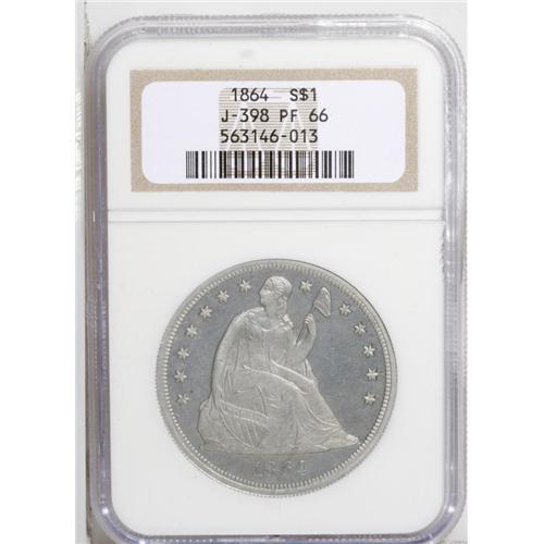 <B>1864 S$1 Seated Liberty Dollar, Judd-398, Pollock-466, High R.7, PR66 NGC.</B></I> The regular issue obverse for the 1864 Seated Liberty dollar is combined with the regular issue With Motto Seated Liberty reverse. Struck in aluminum with a reeded edge. This is an extremely rare pattern issue with not more than four examples known. It is a splendid proof with excellent cameo contrast. The mirrored surfaces have pleasing light gray color with a hint of pale blue. Although often cataloged or offered as transitional issues, it is now known that these pattern pieces were actually produced in the late 1860s or early 1870s for sale to collectors.<BR><I>From The Jones Beach Collection.</B></I><BR><BR><b>Shipping:</b> Coin/Currency (<a target="_blank" href="http://www.heritageauctions.com/common/shipping.php">view shipping information</a>)