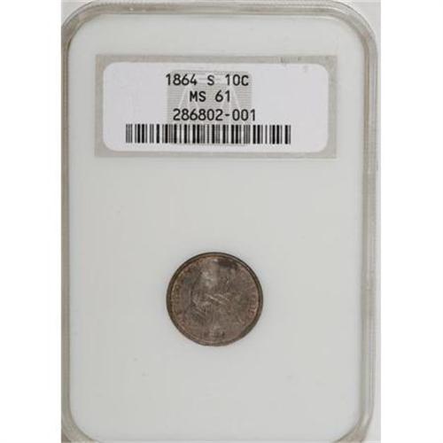 <B>1864-S 10C MS61 NGC.</B></I> Well struck with subtle luster beneath dusky, dappled gold, violet, and silver-blue patina. A distinctive and unworn survivor from an issue of just 230,000 pieces, more appealing than the grade might suggest. Census: 1 in 61, 17 finer (11/07).<BR><BR><B>Coin Engraver:</B> Christian Gobrecht<BR><BR><b>Shipping:</b> Coins & Currency (<a target="_blank" href="http://www.heritageauctions.com/common/shipping.php">view shipping information</a>)