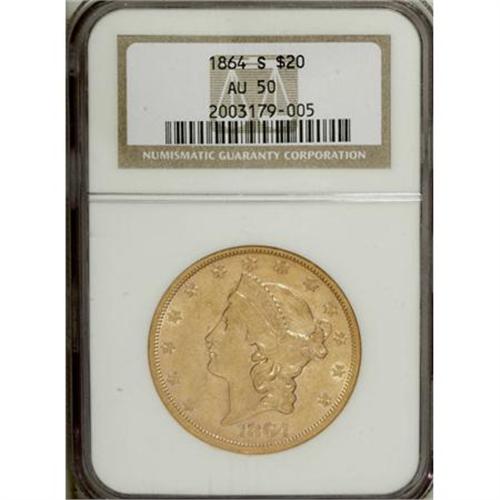 <B>1864-S $20 AU50 NGC.</B></I> This piece is much more attractive than the average AU50 example, perhaps because of the shimmering luster and the lovely rose and green-gold toning that adorns both sides. Typically worn on the highpoints, with mostly small marks that seem consistent with NGC's grade determination. <BR><BR><b>Shipping:</b> Coins & Currency (<a target="_blank" href="http://www.heritageauctions.com/common/shipping.php">view shipping information</a>)