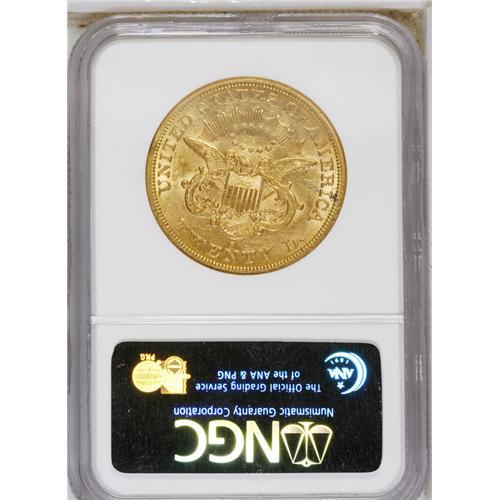 <B>1864-S $20 AU53 NGC.</B></I> Traces of luster occur in the protected areas of this honey-gold S-Mint double eagle. Nice detail remains, and a few minute bagmarks are noted.<BR><BR><b>Shipping:</b> Coin/Currency (<a target="_blank" href="http://www.heritageauctions.com/common/shipping.php">view shipping information</a>)