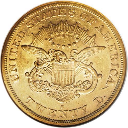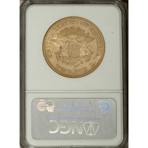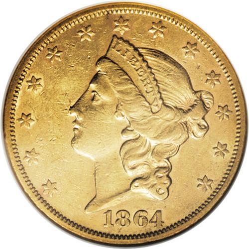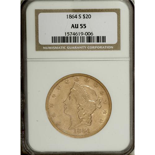 <B>1864-S $20 AU55 NGC.</B></I> After the discovery of the <I>S.S. Brother Jonathan</B></I> the 1864-S is now one of the more available Type One twenties. This is a pleasing AU coin that shows significant portions of mint luster around the devices. Well struck, there are no mentionable or detracting abrasions on this choice piece. Attractive, reddish tinged surfaces on each side.<BR><BR><b>Shipping:</b> Coins & Currency (<a target="_blank" href="http://www.heritageauctions.com/common/shipping.php">view shipping information</a>)