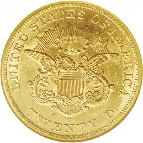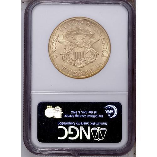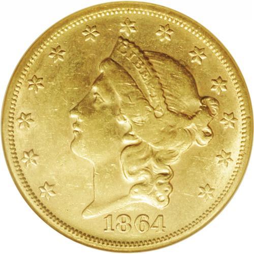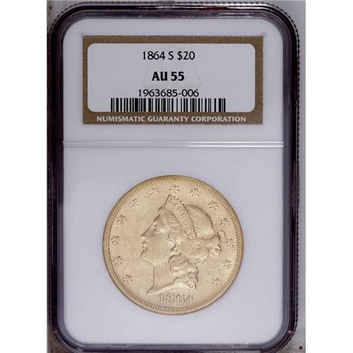<B>1864-S<$20> AU55 NGC.</B></I> Not only is this example at least 10 points finer than the typically encountered '64-S, but its satiny surfaces are much cleaner than one expects of the grade. Delicate golden accents are found within the protected areas.
