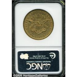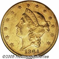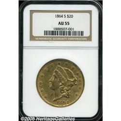 <B>1864-S $20 AU55 NGC.</B></I> Very scarce in higher grades as most of the known examples are XF and below. This is a sharply struck coin with a somewhat dirty appearance and some remaining luster. Each side shows a reasonable number of small to mid-sized abrasions for the grade. An affordable opportunity for this conditionally elusive date.