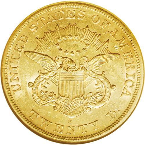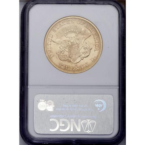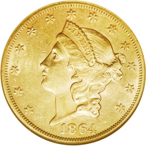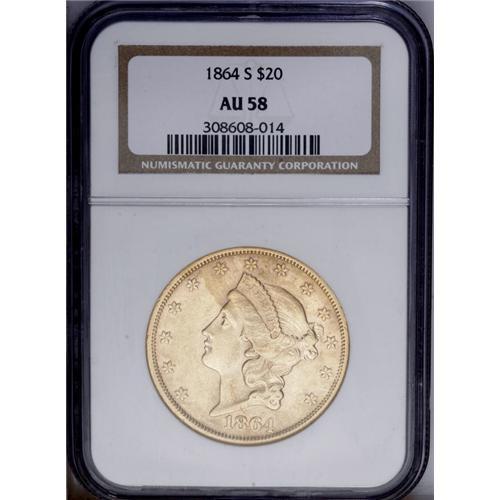 <B>1864-S $20 AU58 NGC.</B></I> As with most double eagles from the San Francisco Mint, the surfaces show moderate abrasions from handling and brief circulation. Fully struck by the dies, with bits of luster remaining in the fields.