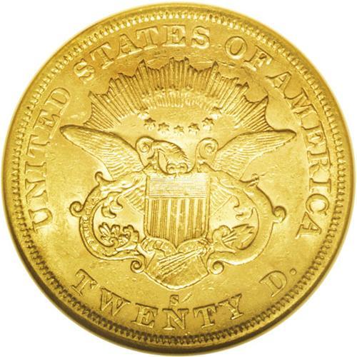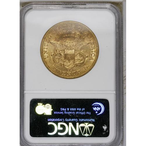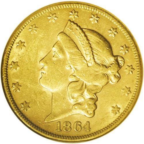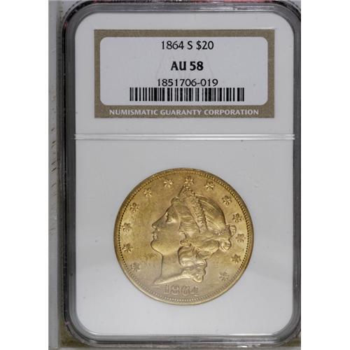 <B>1864-S<$20> AU58 NGC.</B></I> Orange-tinted luster is particularly plentiful on the reverse. A problem-free near-Mint example of the only collectible S-mint gold denomination from 1864. Unlike many lightly circulated twenties, this piece is void of heavy marks. Light clashmarks from the rays and shield are noted near Liberty's ear and behind her neck curls.