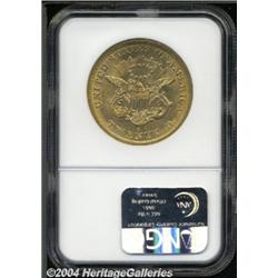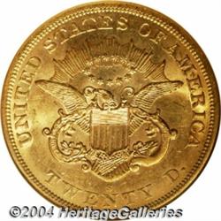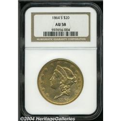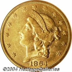 <B>1864-S<$20> AU58 NGC.</B></I> Adequately struck, with nice remaining luster. The surfaces are relatively clean, save for a few slide marks, and are toned an apricot-gold color. Population: 52 in 58, 50 finer (6/04). <BR><BR><B>Important notice:</B> Heritage usually auctions material at the rate of 200-250 lots per hour. On some occasions eBay Live bid software or the Internet may not be able to keep up with the pace of the auction. We recommend placing a realistic absentee bid now as insurance to avoid disappointment. Occasionally the auctioneer may eliminate or reject an eBay Live bid, and the auctioneer may also reopen a lot after the close of the eBay live bidding (usually because we missed an audience bid), and may reject your bid even if it shows you as the winning bidder. By bidding via eBay Live, you agree that Heritage may award the lot to another bidder at its sole discretion under the circumstances described above or any other reasonable circumstances. Since eBay bids are not shown to us until we open the lot on the floor, we treat those bids just like floor bids. In most cases the floor responds before the eBay bid is presented to us, due to Internet lag time, so for consistency we have made it a policy that floor bids are always considered first over tie eBay live bids. Also please note that all Heritage lots purchased through eBay Live carry a 20% Buyer's Premium. Please make sure you read the Terms and Conditions before you bid. </span></font></tr></table></td></tr></table>
