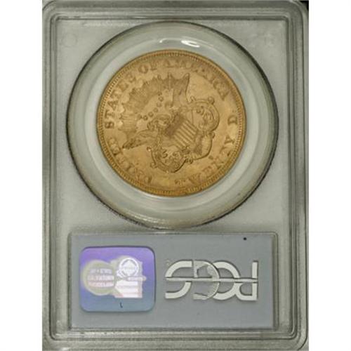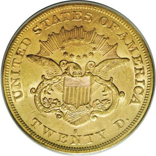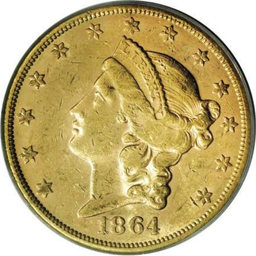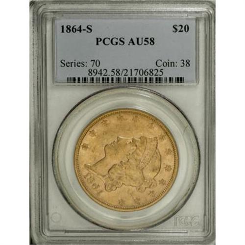 <B>1864-S $20 AU58 PCGS.</B></I> Adequately struck, with nice remaining luster. The surfaces are typically marked on either side and are toned an apricot-gold color. Conditionally scarce, most examples fall into the VF to XF grade range, although the <I>S.S. Brother Jonathan </B></I>and <I>S.S. Republic</B></I> shipwreck finds have increased the availability of higher-grade pieces. Population: 41 in 58, 45 finer (11/07).<BR><BR><B>Coin Engraver:</B> James B. Longacre<BR><BR><b>Shipping:</b> Coins & Currency (<a target="_blank" href="http://www.heritageauctions.com/common/shipping.php">view shipping information</a>)