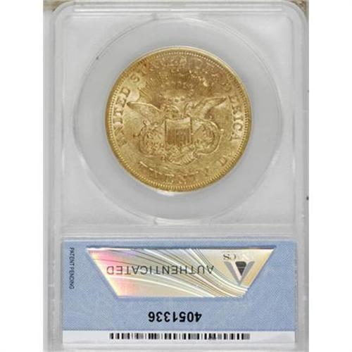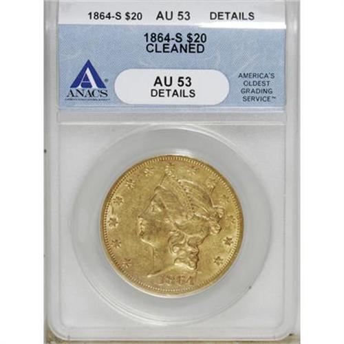 <B>1864-S $20 --Cleaned--ANACS. AU53 Details.</B></I> Both sides retain significant original luster despite telltale hairlines that indicate a past cleaning. The yellow-gold surfaces show light, scattered abrasions and minor wear on softly struck devices.<BR><BR><B>Coin Engraver:</B> James B. Longacre<BR><BR><b>Shipping:</b> Coins & Currency (<a target="_blank" href="http://www.heritageauctions.com/common/shipping.php">view shipping information</a>)