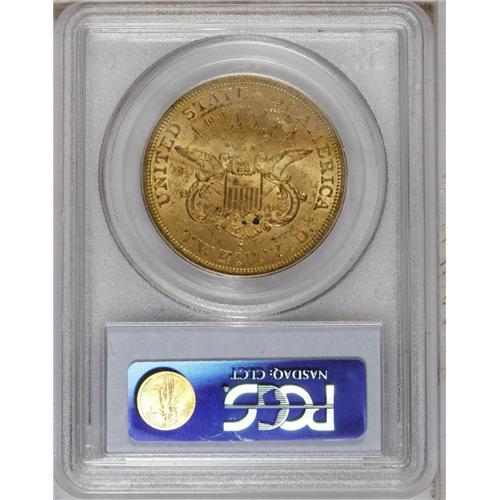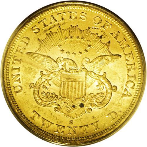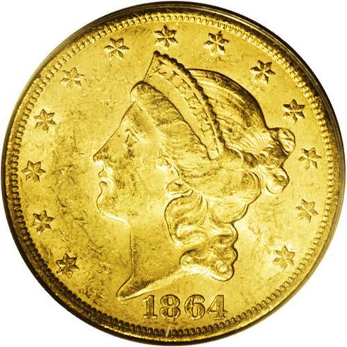 <B>1864-S<$20> MS61 PCGS.</B></I> The lustrous surfaces of this example have deep yellow color with hints of dark green color. The surfaces are noticeably abraded as almost always on these large gold coins. This example is clearly not one of the treasure coins, but probably spent many years overseas in European bank vaults.