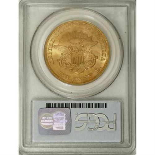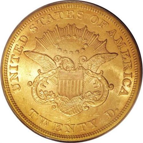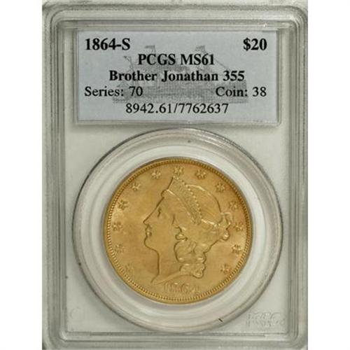 <B>1864-S $20 MS61 PCGS.</B></I> Ex: Brother Jonathan 355. Fictional character Brother Jonathan was the early 19th century equivalent of Uncle Sam, a personification of the United States. The <I>S.S. Brother Jonathan </B></I>made its first voyage on November 11, 1850. It sank on July 30, 1865, near the Oregon coastline, with a loss of approximately 200 lives. The wreck was discovered on September 30, 1992 by Deep Sea Research, Inc.<BR> This satiny peach-gold example is generally well struck, with minor softness on a few letters in STATES OF. There are no heavy marks, which is unusual for an MS61 double eagle. An outstanding souvenir from one of the three most famous American numismatic shipwrecks (the other two were the <I>S.S. Central America </B></I>and <I>S.S. Republic</B></I>.)<BR><I>Ex: The S.S. Brother Jonathan Treasure Coins (Bowers and Merena, 5/99), lot 358, which realized $6,900.</B></I><BR><I>From The Vanek Collection.</B></I><BR><BR><b>Shipping:</b> Coins & Currency (<a target="_blank" href="http://www.heritageauctions.com/common/shipping.php">view shipping information</a>)