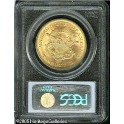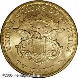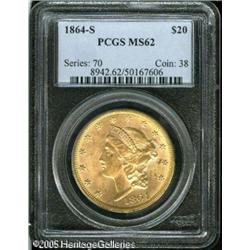 <B>1864-S $20 MS62 PCGS.</B></I> The popularity of Civil War era double eagles has made it very easy for the market to absorb the hundred or so mint condition 1864-S twenties found in the recovery efforts from the <I>S.S. Brother Jonathan.</B></I> This is a very attractive example that has swirling mint frost and a strong strike on each side. A few abrasions and luster grazes on the obverse account for the grade. Population: 7 in 62, 3 finer (1/05). Lot:9015