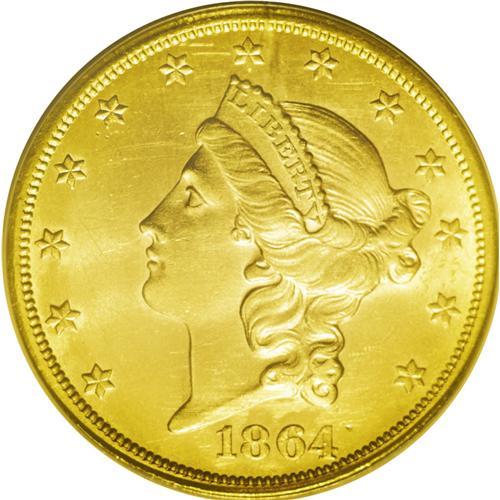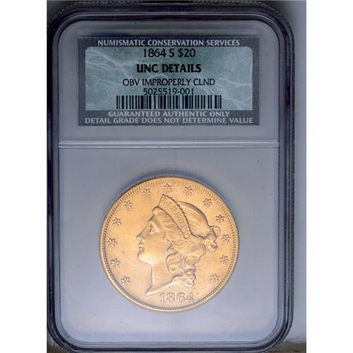 <B>1864-S<$20>--Obverse Improperly Cleaned--NCS. Unc. Details.</B></I> Nearly every coin in The Wyoming Collection is an aesthetically pleasing and highly desirable example. This example is the only exception to the rule, perhaps a tribute to the elusive nature of this issue, even despite treasure coins found in recent years. At the time that most coins in this collection was acquired, such treasure coins had not been yet been found. This example is sharply struck with frosty orange-gold luster. The obverse has a number of hairlines and other minor scratches, while the reverse is pristine.<BR><I>From The Wyoming Collection.</B></I>
