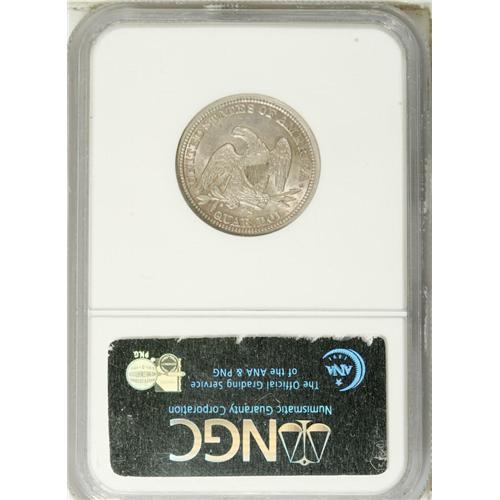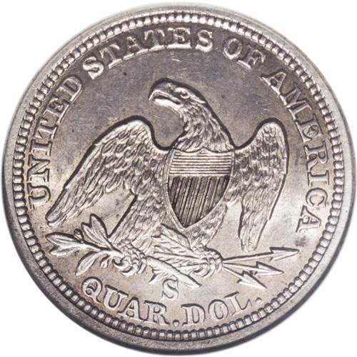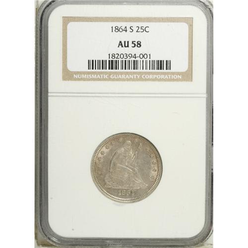 <B>1864-S 25C AU58 NGC.</B></I> In a series replete with rarities, the '64-S stands out as one of the most difficult S-mint Seated Quarters to locate in all grades. The evenly toned, dusky, golden-gray surfaces display nice residual luster, and present rather well for the grade. There are no sizeable abrasions and the devices retain crisp definition. One of a mere 20,000 pieces produced. Census: 4 in 58, 7 finer (10/06).<BR><BR><b>Shipping:</b> Coin/Currency (<a target="_blank" href="http://www.heritageauctions.com/common/shipping.php">view shipping information</a>)