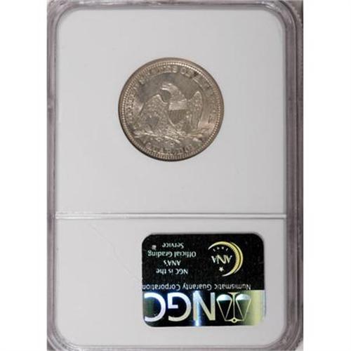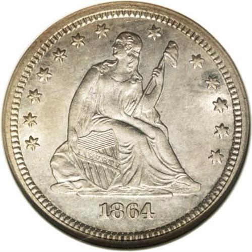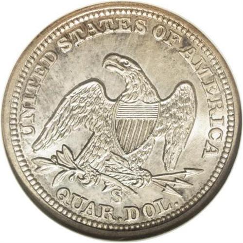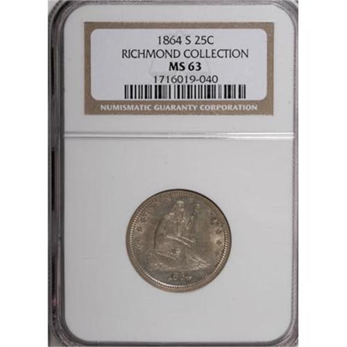 <B>1864-S 25C MS63 NGC.</B></I> Ex: Richmond Collection. This issue, mintage 20,000 pieces, experienced heavy circulation in Civil War-era California. Between low production and high attrition, Mint State representatives are particularly elusive and highly prized. Larry Briggs, in his <I>The Comprehensive Encyclopedia of United States Liberty Seated Quarters</B></I>, writes that the 1864-S is a "rare date," noting that the vast majority of survivors " ... are low grade coins - about good to very good; XF and better are extremely rare."<BR> This undeniably appealing Select coin has soft, swirling luster beneath delicate patina. Cream and silver-white combine with hints of rose and blue. Well-defined overall, if a touch soft on the right obverse stars, with few overt flaws and marvelous eye appeal. Census: 1 in 63, 6 finer (2/08).<BR><BR><B>Coin Engraver:</B> Christian Gobrecht<BR><BR><b>Shipping:</b> Coins & Currency (<a target="_blank" href="http://www.heritageauctions.com/common/shipping.php">view shipping information</a>)