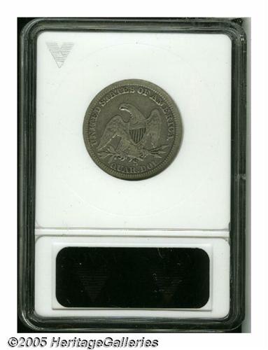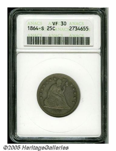 <B>1864-S<25C> VF30 ANACS.</B></I> In a series replete with rarities, the '64-S stands out as one of the most difficult S-mint deliveries to locate in all grades. Our records indicate that the major auction houses have seen only seven appearances of this issue in all grades of Very Fine over the last 15 years, with just 20 pieces grading higher. The Choice VF offered in this lot has light gray patina over relatively clean surfaces, with the only mentionable mark occurring on the upper part of Liberty's legs.<BR><I>From The Empire State Collection, Part Two.</B></I>