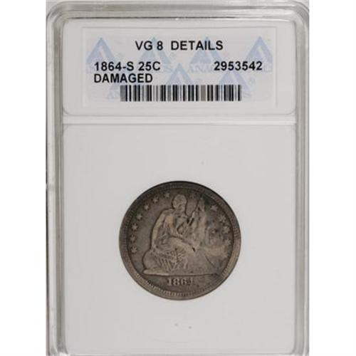 <B>1864-S 25C --Damaged--ANACS. VG8 Details.</B></I> NGC Census: (0/31). PCGS Population (2/27). Mintage: 20,000. Numismedia Wsl. Price for NGC/PCGS coin in VG8 : $435. (#5460)<BR><BR><B>Coin Engraver:</B> Christian Gobrecht<BR><BR><b>Shipping:</b> Coins & Currency (<a target="_blank" href="http://www.heritageauctions.com/common/shipping.php">view shipping information</a>)