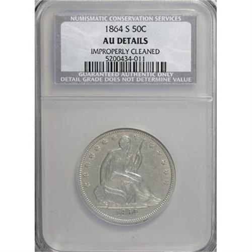 <B>1864-S 50C --Improperly Cleaned--NCS. AU Details.</B></I> NGC Census: (0/0). PCGS Population (0/0). Mintage: 658,000. (#6312)<BR><BR><B>Coin Engraver:</B> Christian Gobrecht<BR><BR><b>Shipping:</b> Coins & Currency (<a target="_blank" href="http://www.heritageauctions.com/common/shipping.php">view shipping information</a>)