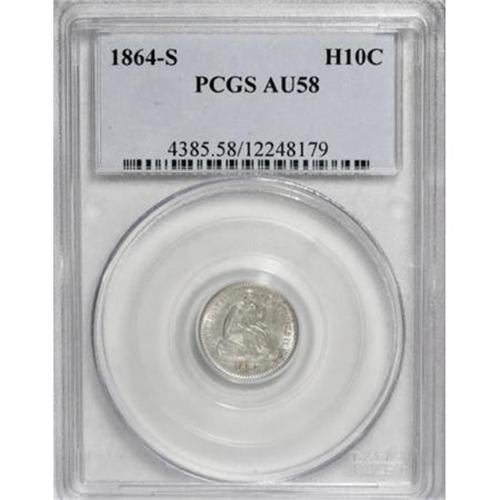 <B>1864-S H10C AU58 PCGS.</B></I> Bright, satiny luster illuminates the mostly untoned silver-gray surfaces, with just a few faint olive and rose toning specks near the obverse borders. Boldly struck with minor clash marks noted on each side. A scarce S-mint issue, with only 90,000 pieces produced.<BR><I>From The Al Blythe Collection of Half Dimes.</B></I><BR><BR><B>Coin Engraver:</B> Christian Gobrecht<BR><BR><b>Shipping:</b> Coins & Currency (<a target="_blank" href="http://www.heritageauctions.com/common/shipping.php">view shipping information</a>)
